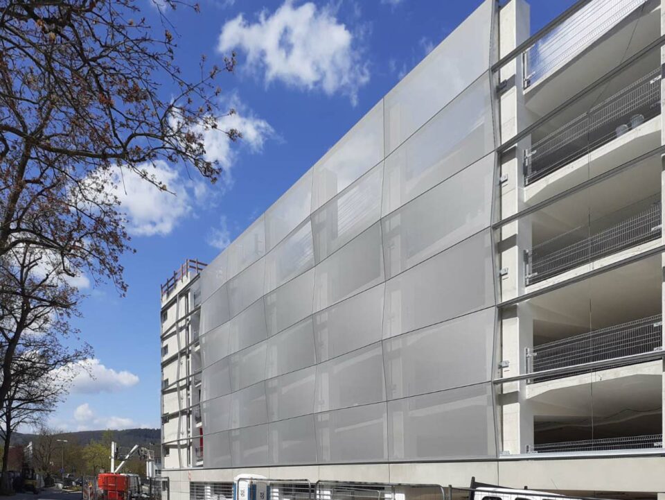 Die Fassade an der Zufahrt zum Parkhaus wurde in 3-dimensionaler Form als Textilfassade mit einer Bespannung aus Glasfasergewebe ausgeführt. Dies sorgt für eine sehr gute Belüftung des Parkhauses und ein einzigartiges Erscheinungsbild der Fassade, welches sich ständig durch das Spiel von Licht und Schatten verändert. Auf der Rückseite des Gebäudes sorgt eine Schallschutzfassade für die ausreichende Belüftung bei gleichzeitigem Schallschutz für die Nachbarbebauung.